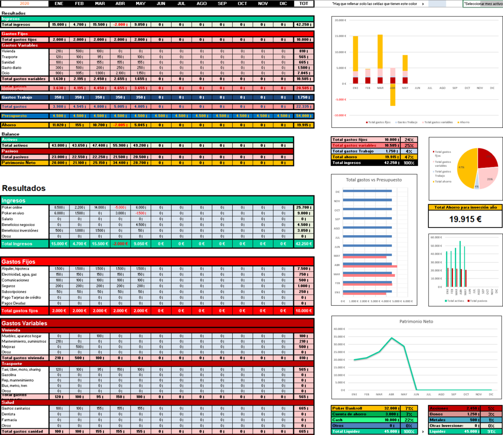 Cuenta con un flujo de caja, donde incluiremos todos nuestros gastos e ingresos. Tanto los relacionados con el póker como con otras actividades. Y una segunda parte que será balance de resultados, donde incluiremos nuestro estado financiero actual, incluyendo todos nuestros activos (póker bankroll) y nuestros pasivos (deudas).